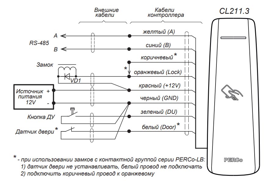 Взаимное удаление контроллеров замка PERCo-CL211.3 друг от друга и от других считывателей должно составлять не менее 50 см.