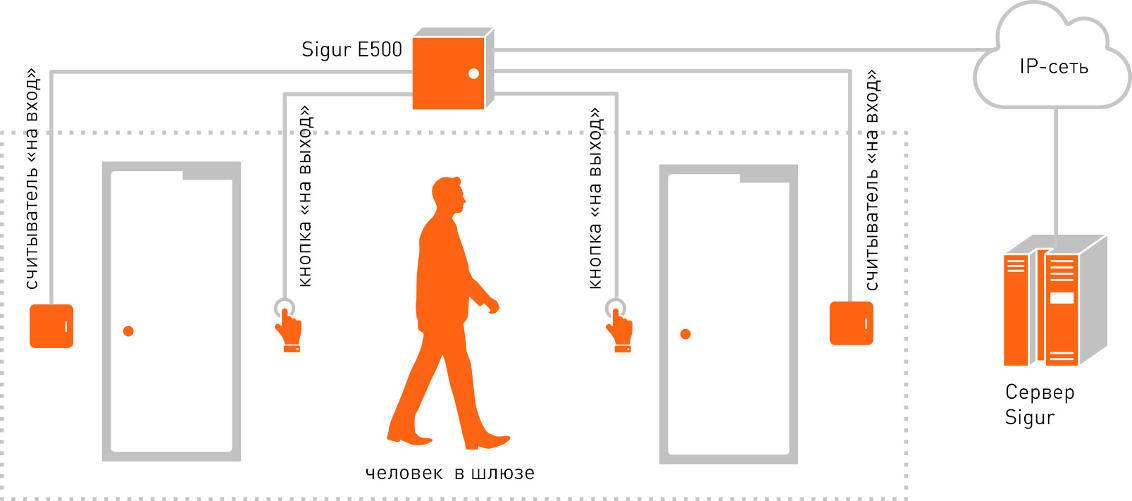 Логика работы контроллера Sigur позволяет организовать шлюзовой тамбур на базе двух дверей (при активации определенных настроек) или подключить к нему готовую шлюзовую кабину.