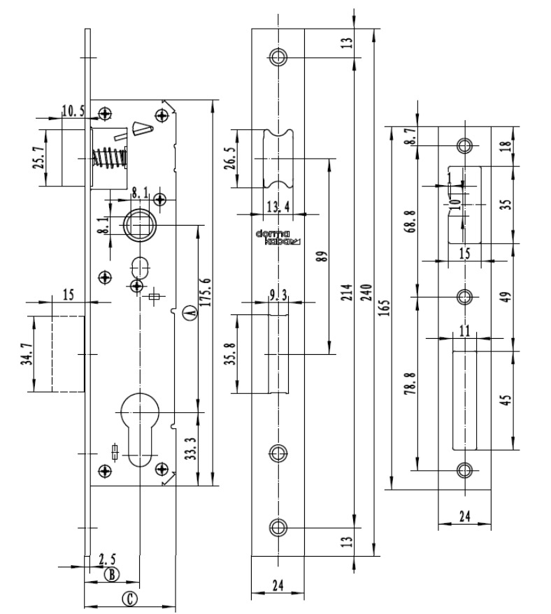 • Замок с торцевой планкой 24 мм для дверей из алюминиевого профиля.