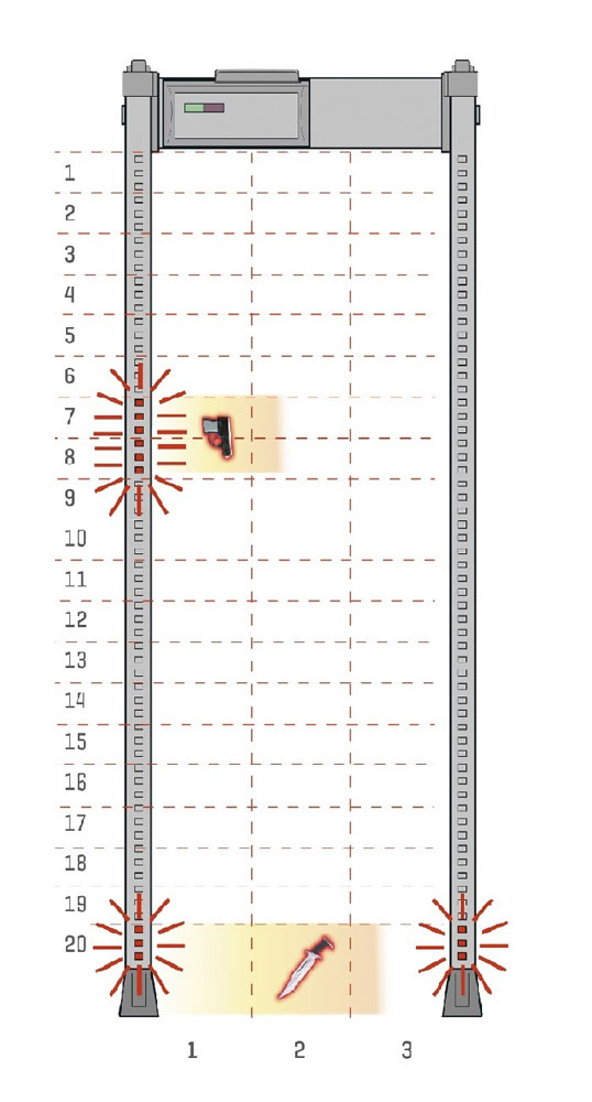 - Визуальная - Локализация обнаруженного объекта в 20 зонах с помощью вертикальных световых линеек, расположенных на боковых панелях. Зеленая и красная сигнализация на блоке управления с градацией по массе детектируемого объекта