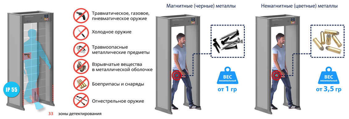 Во время прохода человека через металлодетектор с запрещенным к проносу предметом срабатывает световая и звуковая индикация, информация передается через проводное соединение на турникет (шлюзовую кабину, автоматическую дверь и т.д.), который блокирует дальнейшее движение человека. Если запрещенных к проносу предметов нет, то турникет разрешит доступ.