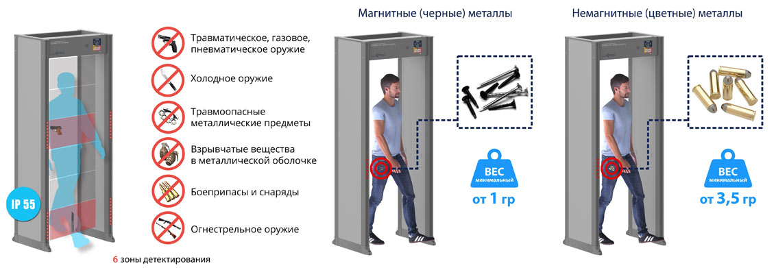 Во время прохода человека через металлодетектор с запрещенным к проносу предметом срабатывает световая и звуковая индикация, информация передается через проводное соединение на турникет (шлюзовую кабину, автоматическую дверь и т.д.), который блокирует дальнейшее движение человека. Если запрещенных к проносу предметов нет, то турникет разрешит доступ.