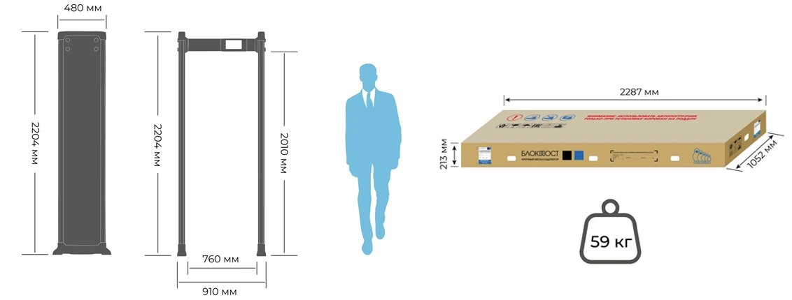 - Габариты прохода (Д×Ш×В): 480×760×2010 мм
