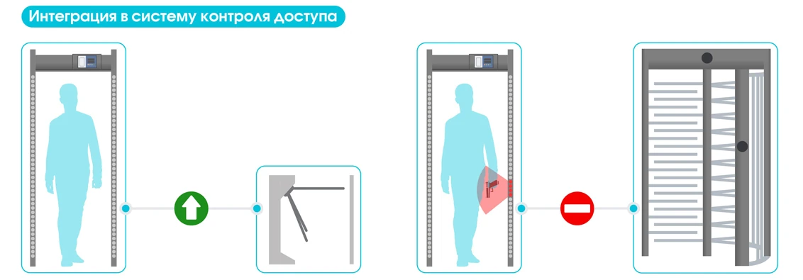Арочный металлодетектор БЛОКПОСТ "МАТРЁШКА" PC Vx 1800 (18/12/6) может быть интегрирован в автоматизированную систему контроля доступа (СКУД), что позволяет:- Автоматически блокировать турникеты или шлюзовые кабины при срабатывании детектора.