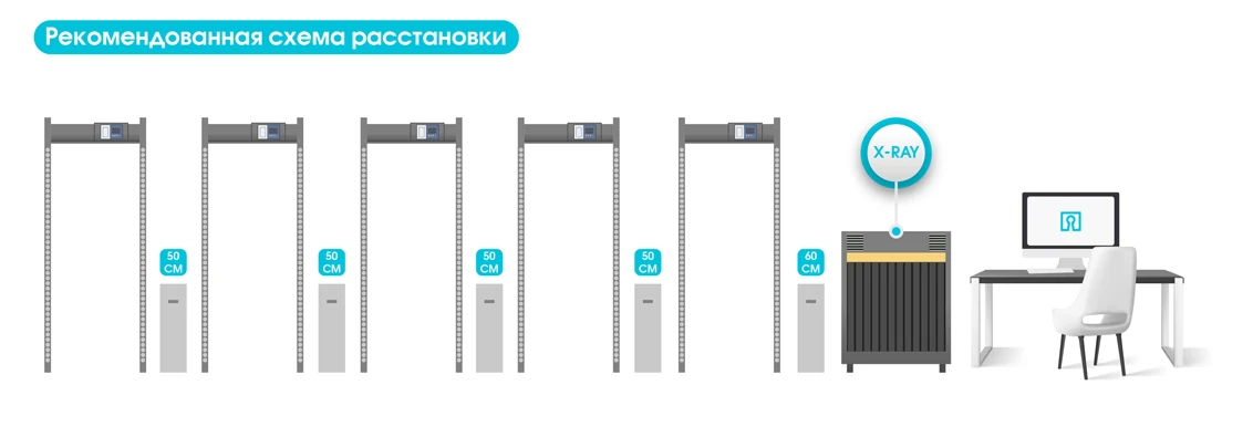Оптимальное размещение металлодетекторов зависит от условий эксплуатации. Для объектов с высокой проходимостью (аэропорты, вокзалы, массовые мероприятия) рекомендуется установка нескольких проходных зон, разделённых направляющими барьерами. В узких проходах, коридорах и на закрытых территориях металлодетектор можно комбинировать с турникетами или шлюзовыми кабинами. Кроме того, устройства могут быть синхронизированы для работы в связке до 50 конструкций, что позволяет организовать единый проходной комплекс. Минимальное расстояние между металлодетекторами при этом должно составлять от 50 см, чтобы избежать взаимных помех.
