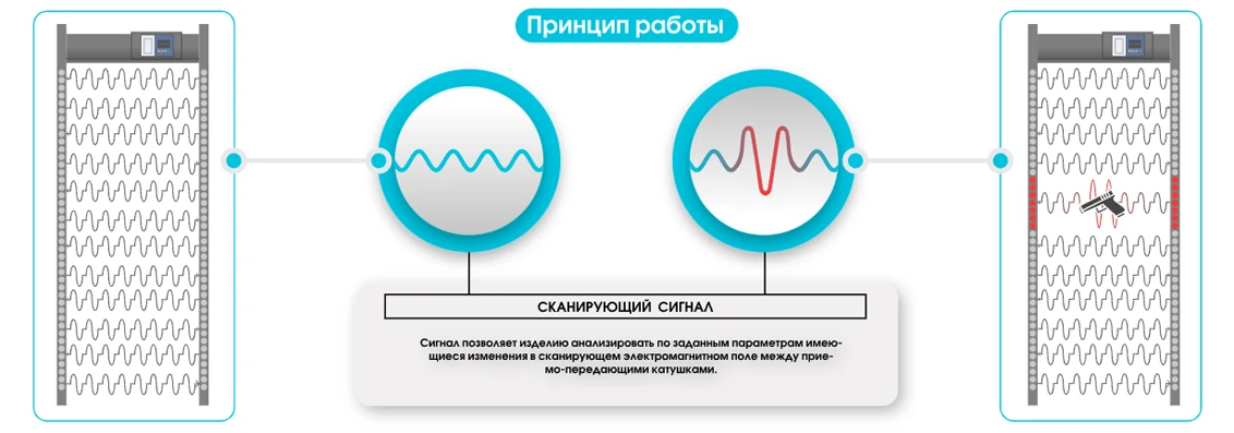 В основе работы металлодетектора лежит много зональная система электромагнитных катушек и цифровая обработка сигналов, обеспечивающая равномерное покрытие зоны контроля без «слепых» участков. Устройство поддерживает конфигурации 6 / 12 / 18 зон, имеет независимую регулировку чувствительности и интеллектуальное программное управление. Камеры, установленные на перекладине и антенных панелях, передают изображение посетителя в трёх проекциях, повышая точность досмотра и снижая количество ложных тревог.