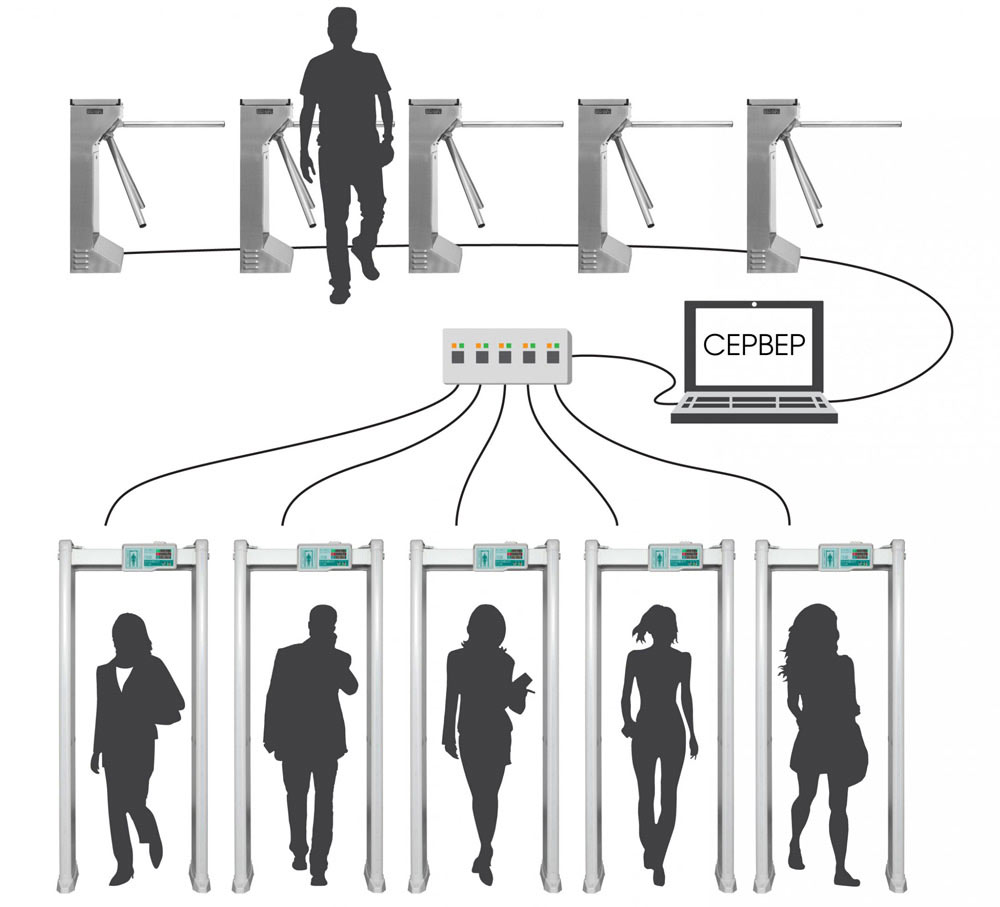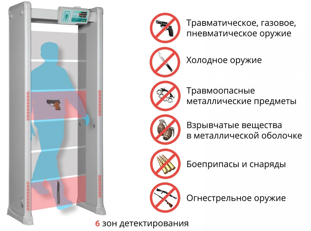 Во время прохода человека через металлодетектор с запрещенным к проносу предметом срабатывает световая и звуковая индикация, информация передается через проводное соединение на турникет (шлюзовую кабину, автоматическую дверь и т.д.), который блокирует дальнейшее движение человека. Если запрещенных к проносу предметов нет, то турникет разрешит доступ.
