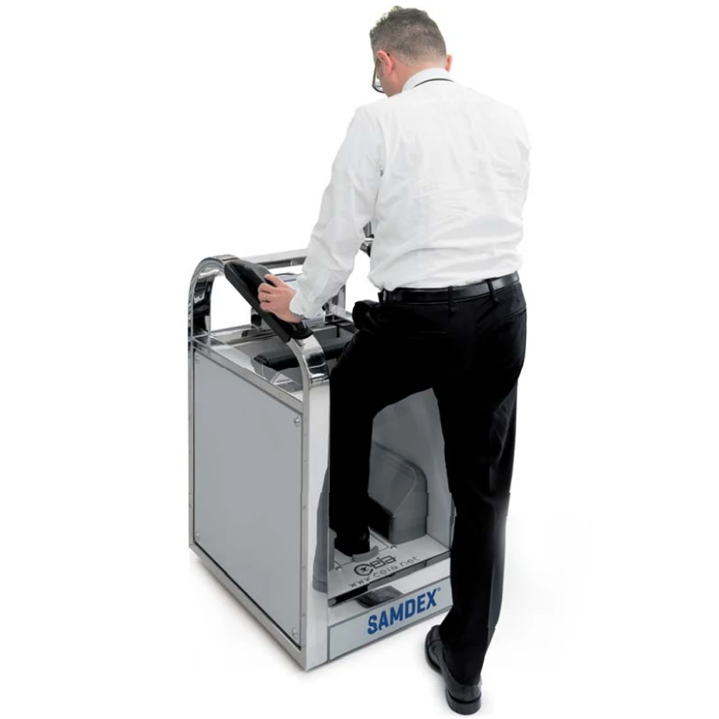 Устройство использует измерение физических свойств материалов и низкочастотные электромагнитные поля, безопасные для человека, что подтверждено сертификацией DGAC-STAC. Конструкция включает платформу-ступень с позиционированием стопы и автоматические подсказки для пассажиров и операторов. Управление сопровождается визуальными и звуковыми сообщениями, обеспечивающими быстрый и однозначный результат проверки («OK/ALARM»). Прочное исполнение, эргономика и возможность интеграции в комплексные линии досмотра делают SAMDEX эффективным элементом современных КПП.
