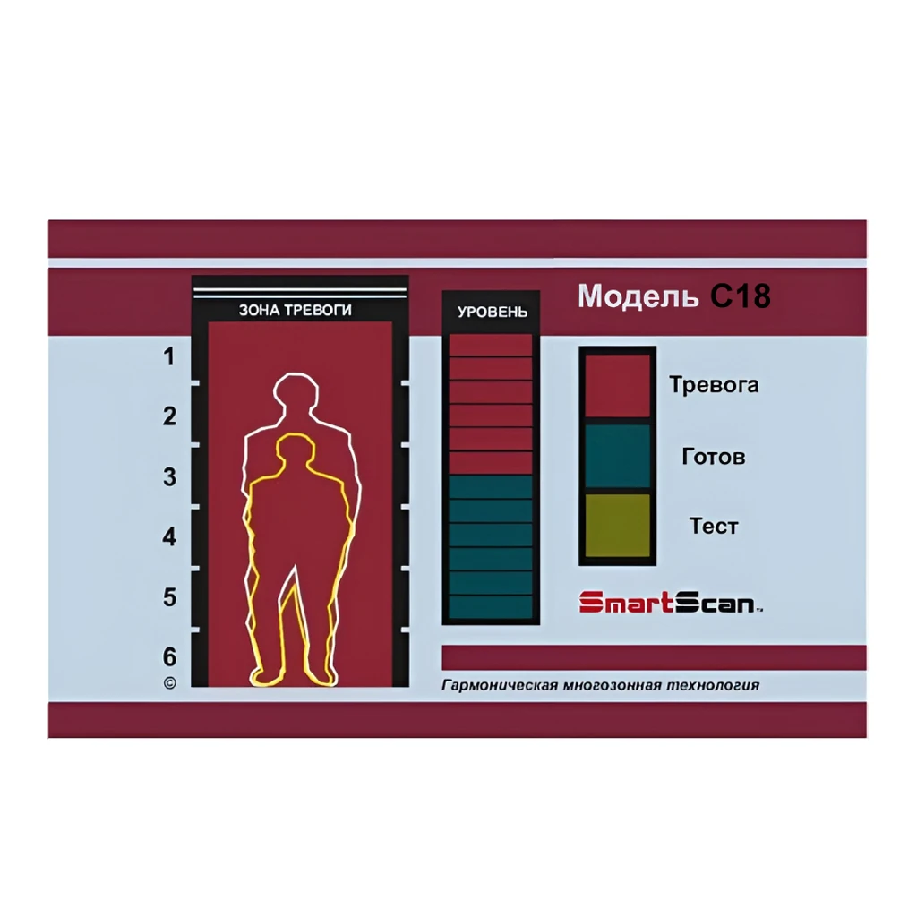 SmartScan C18 оснащён расширенной системой селективности, включающей 22 заводские программы и 100 уровней базовой чувствительности с возможностью регулировки по шести горизонтальным зонам. Это позволяет адаптировать металлодетектор под различные условия эксплуатации — от стандартных входных зон до режимных объектов. Шестнадцать рабочих частот обеспечивают устойчивую работу нескольких рамок, установленных рядом, без взаимных помех. Многофункциональный цветной светодиодный индикатор отображает срабатывание в соответствующей зоне по высоте и стороне проходящего человека, а также показывает текущий уровень сигнала и состояние системы.