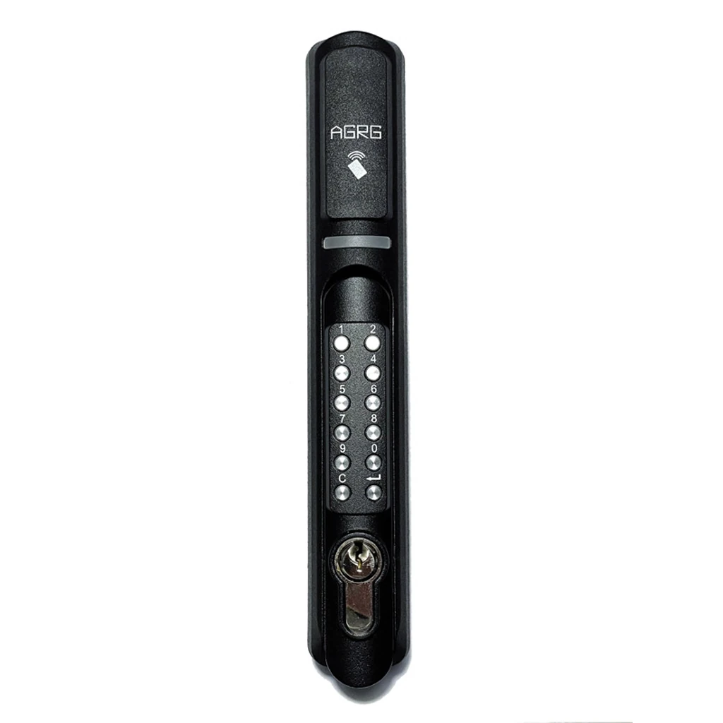 Ручка AGRG SH-D состоит из поворотной рукоятки с электронным замком и кодонаборной панели, а также оснащена считывателем карт стандарта ISO/IEC 14443A, эффективным мотор-редуктором с микропроцессорным управлением для обеспечения минимального электропотребления и интеллектуальных возможностей блокировки и контроля, автономным контроллером с энергонезависимой памятью на 256 записей (код карты + PIN). В случае автономной работы все данные обрабатываются и хранятся непосредственно в устройстве, что исключает необходимость передачи информации на контроллер СКУД или сервер.