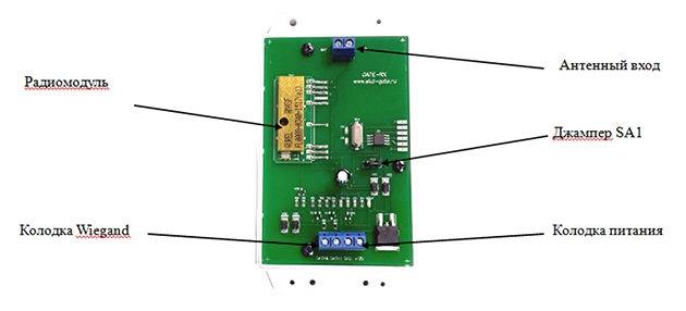Джампер SA1 определяет характеристику выходов Data0, Data1: положение слева - открытый коллектор; положение справа - имеет нагрузку 10кОм. Штатное положение джампера для работы с контроллерам Gate (и аналогичными) — положение справа.