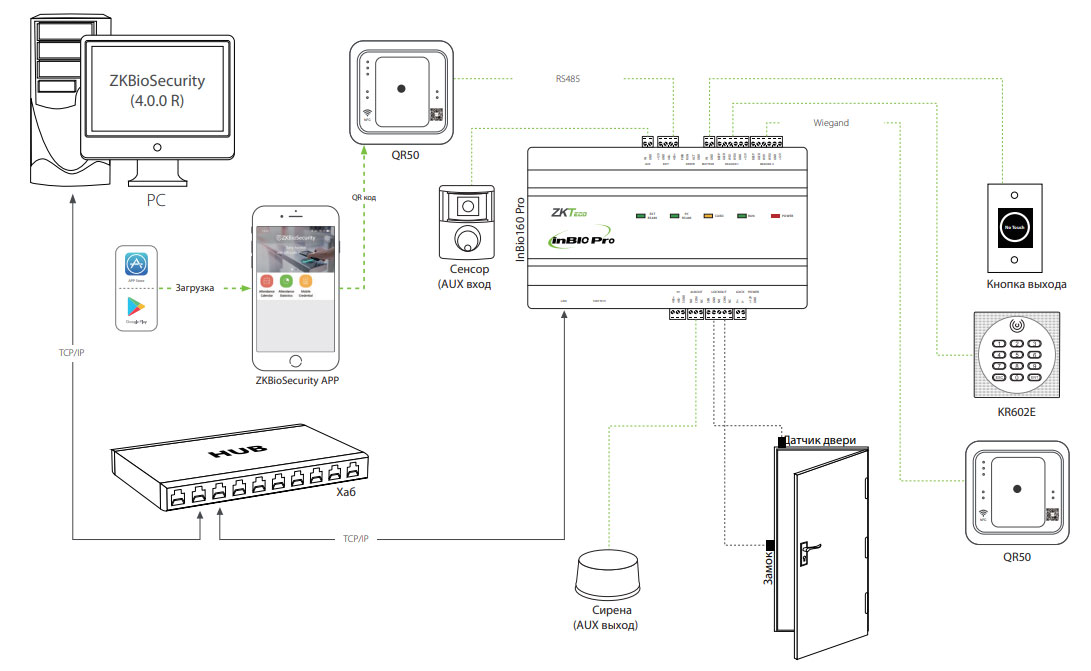 • Наличие интерфейса RS485 для связи с контроллерами ZKTeco
