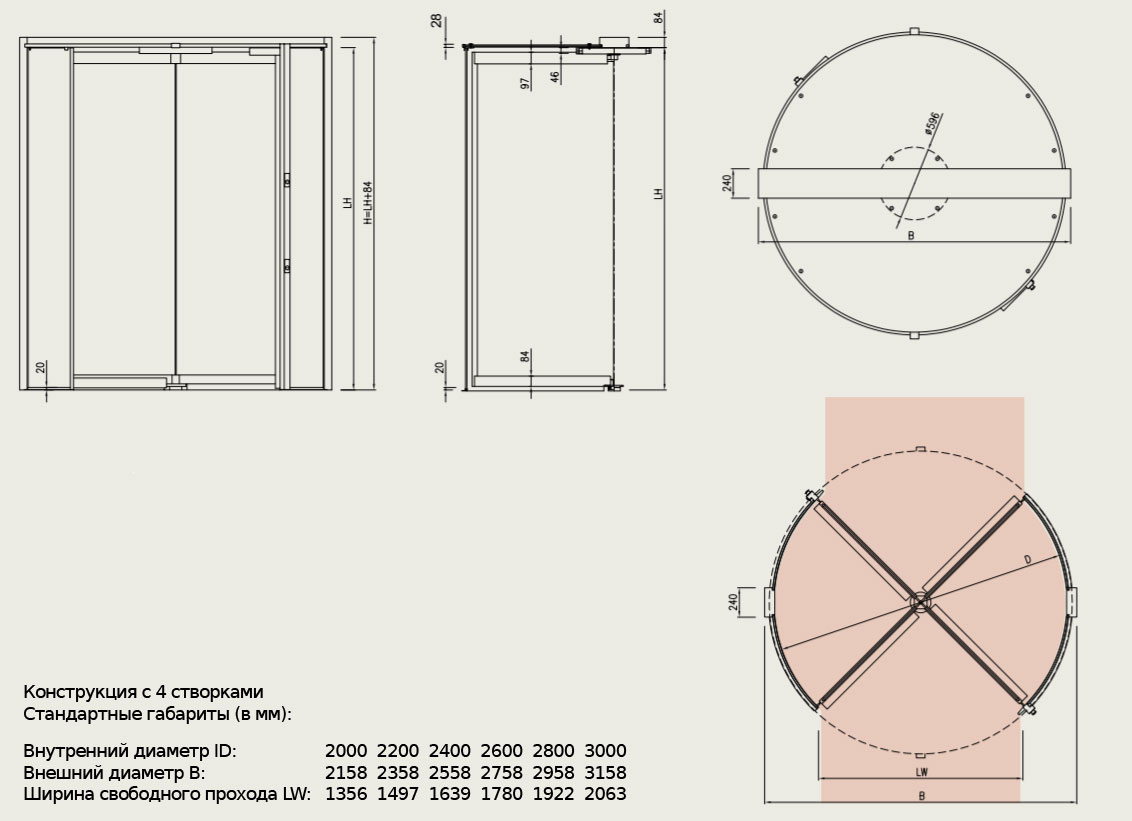| Тип карусельной двери | большой ёмкости | большой ёмкости | стандартная | полностью стеклянная | индивидуальная | защитная |