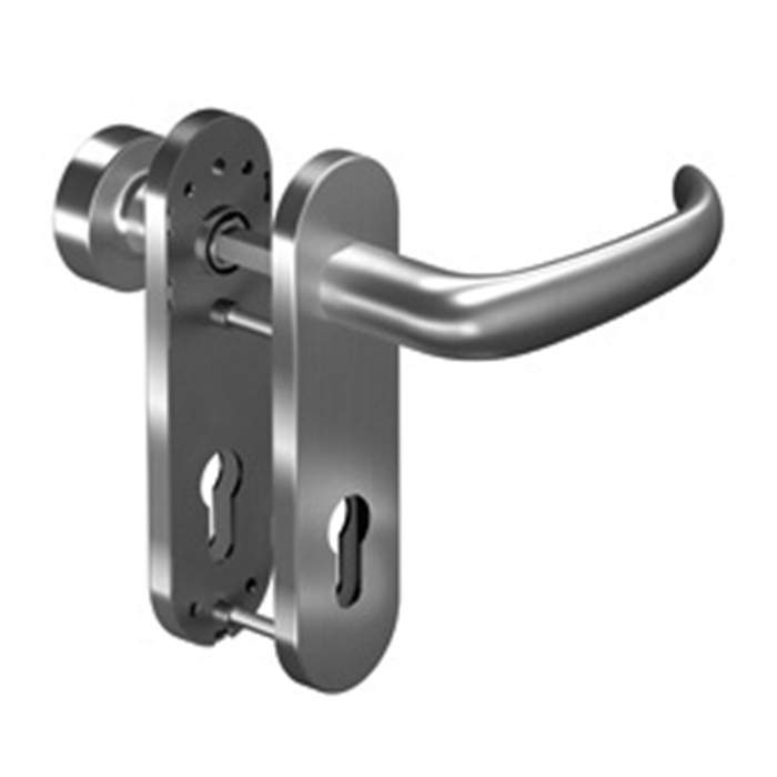 Стальная монтажная пластина ручки помогает надёжно передать даже очень большую нагрузку на дверную створку, защищая конструкцию ручки и замка.