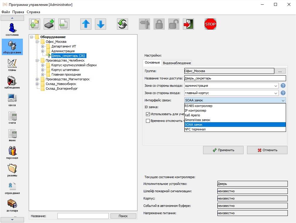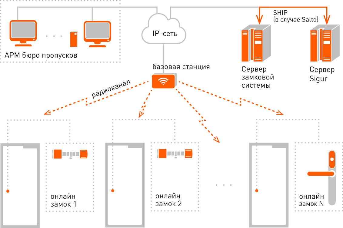 В рамках интегрированной системы могут произвольно сочетаться как обычные контроллеры Sigur, так и различное оборудование Salto: онлайн и офлайн замки или цилиндры.