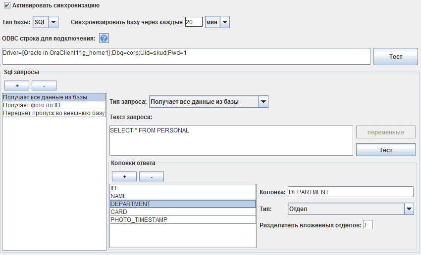 Требуемая настройка: минимальна. Достаточно ввести ODBC строку подключения и один единственный SQL запрос, принимающий из внешней базы все данные, которые требуется синхронизировать. SQL запрос может делать выборку из какой-либо таблицы внешней базы, либо нескольких таблиц (JOIN), либо из специально созданного для СКУД представления (VIEW).