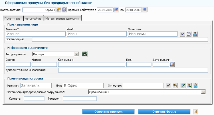 • Внос / вынос материальных ценностей - еще одним дополнительным полезным функционалом, также входящим в базовый модуль системы VisitorControl, является учет вноса и выноса материальных ценностей.