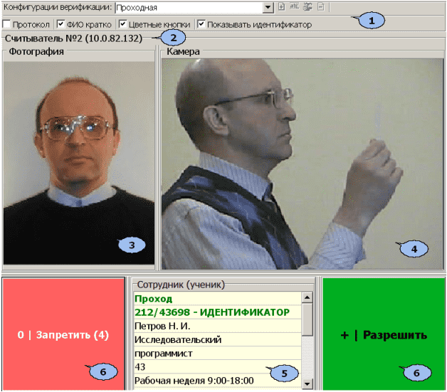 Раздел «Верификация» позволяет сотруднику службы охраны производить идентификацию владельца карты доступа, сравнивая внешность проходящего сотрудника (ученика) или изображение с видеокамеры и фото владельца карты, хранящееся в БД системы, и на основании этого принимать решение о подтверждении его права на проход. Решение может приниматься как вручную оператором, так и в автоматическом режиме. Все действия оператора, информация о фактах предъявления карт доступа и кадры с видеокамер автоматически записываются разделом и доступны для последующего просмотра и анализа в разделе «Журнал верификации».