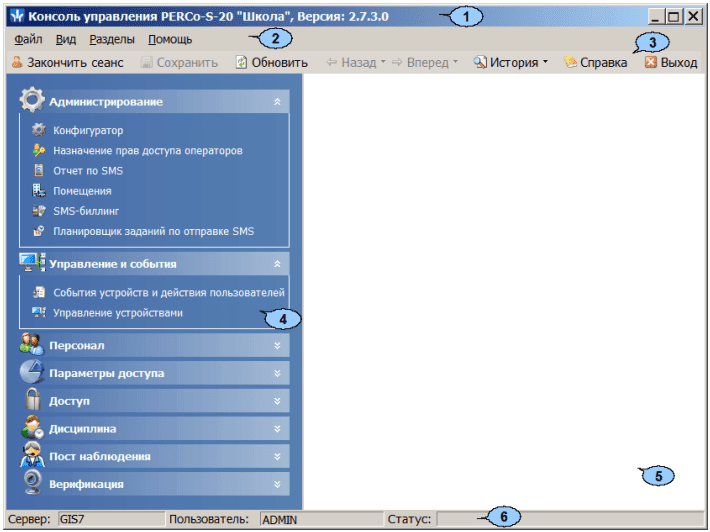 В состав модуля входит «Консоль управления» для открытия разделов ПО и следующие разделы, объединенные на панели навигатора в группы по назначению: