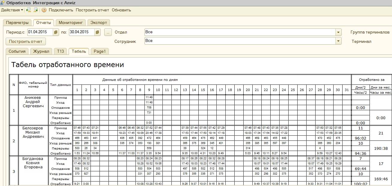 Решение представляет собой внешнюю обработку, написанную для платформы 1С, которая обращается непосредственно к базе данных Anviz, получает и загружает необходимые данные и строит и выводит необходимые отчеты.