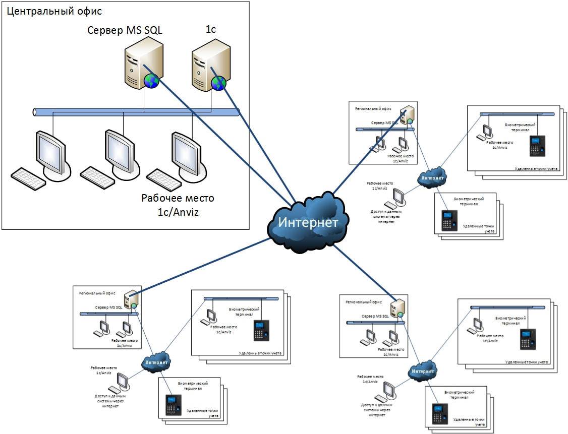 • Возможность организации сетевой инфраструктуры любого масштаба на базе сетевых конфигураций 1С для использования данных учета рабочего времени и управления системой в целом,