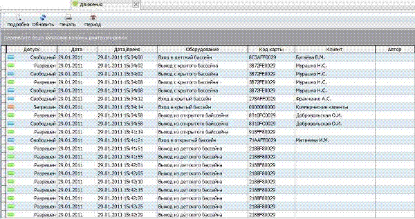Журнал Движений предназначен для отображения движений по картам, которые были зарегистрированы оборудованием СКУД при чтении карт при посещении спортивного комплекса: