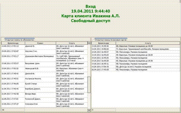 • данные по клиенту (№ карты, фото, активные услуги, дата действия карты, дополнительный доступ);