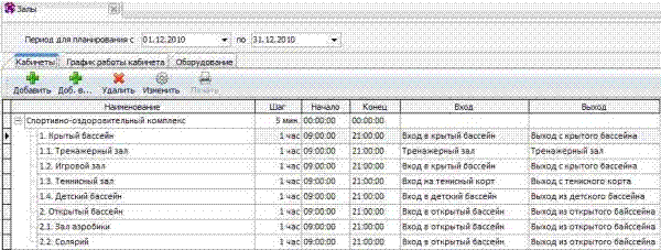 Справочник залов/кабинетов позволяет создать и вести перечень всех залов/кабинетов вашего предприятия и создать оптимальные графики их работы: