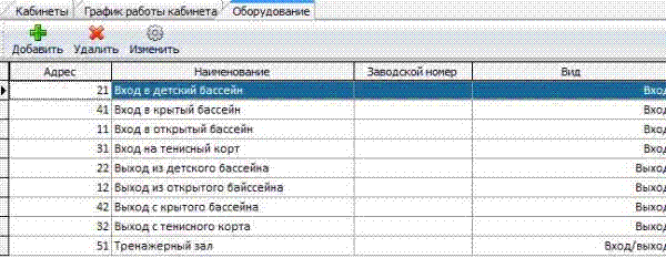 • подключенное оборудование СКУД на вход/выход в/из зала/кабинета