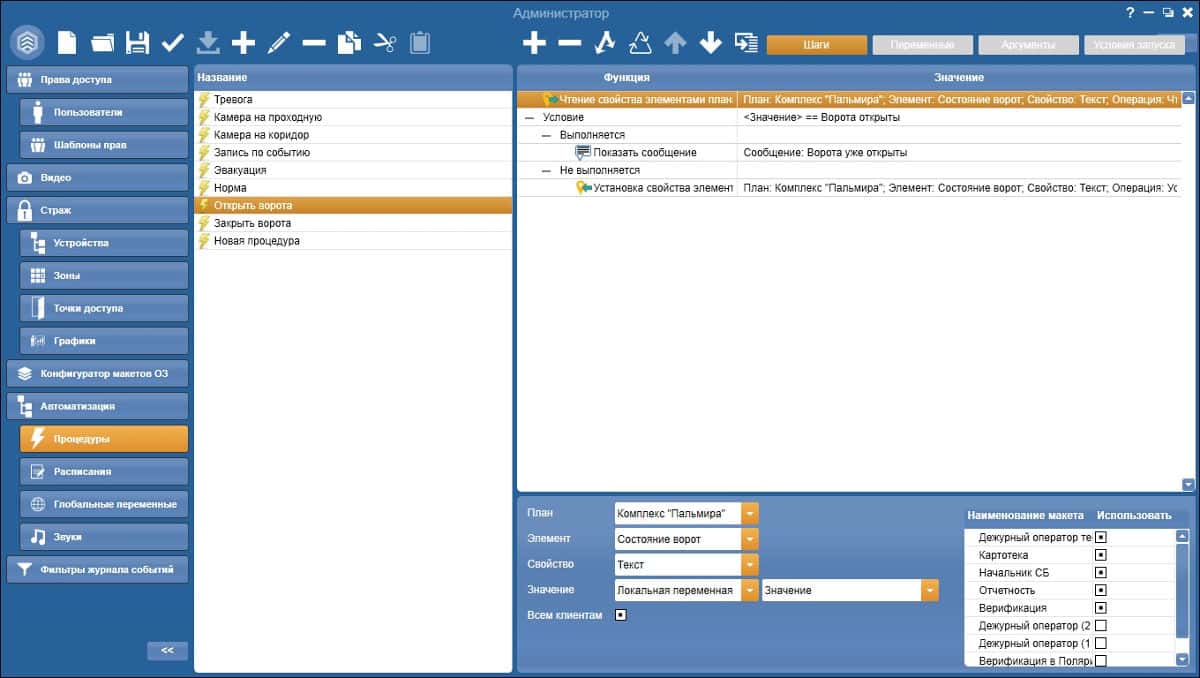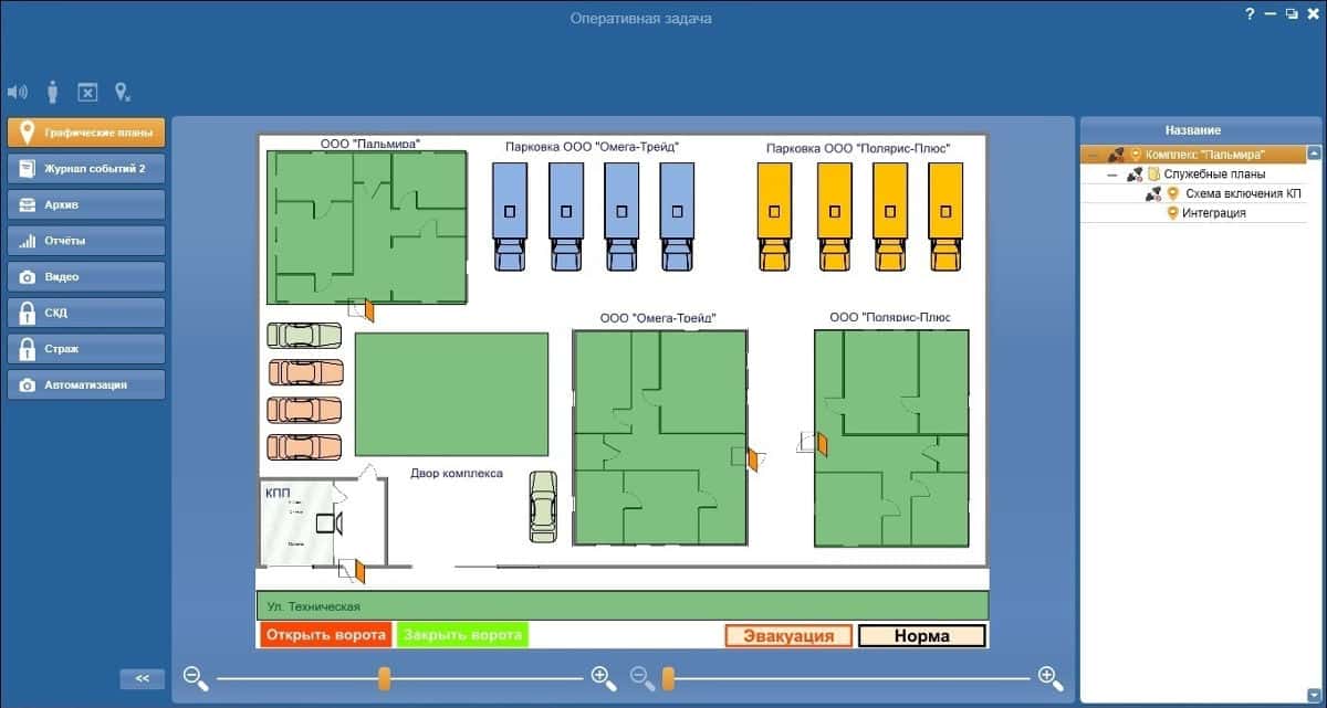 • Редактор планов позволяет включать процедуры автоматизации на планы. Например, добавить тревожные кнопки на план;