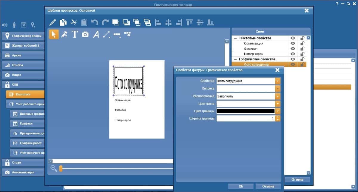 Редактор шаблонов пропусков позволяет формировать макеты графических изображений, которые будут печататься на пропусках сотрудников (посетителей).