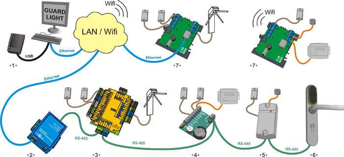 Вариант подключения оборудования для работы с ПО Guard Light: