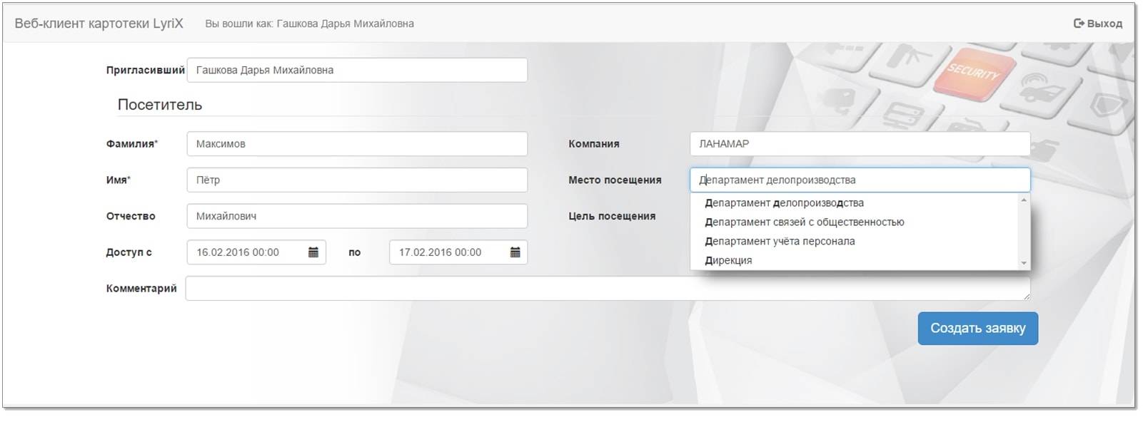 Web-приложение, позволяющее пользователю системы под управлением LyriX подать заявку на оформление посетительского пропуска
