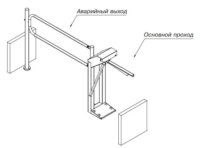 В аварийных и нештатных ситуациях (например, при выходе из строя ИП) зону прохода турникета можно использовать в качестве дополнительного аварийного выхода, предварительно разблокировав вращение его преграждающих планок либо используя планки «Антипаника».