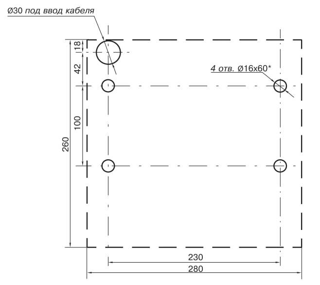Примечание: При необходимости прокладки кабелей под поверхностью пола подготовьте в полу кабельный канал, подходящий к отверстиям для ввода этих кабелей в стойку турникета (рис. 9). Установку и крепление стойки турникета производите после прокладки всех кабелей в кабельном канале и внутри стойки турникета.