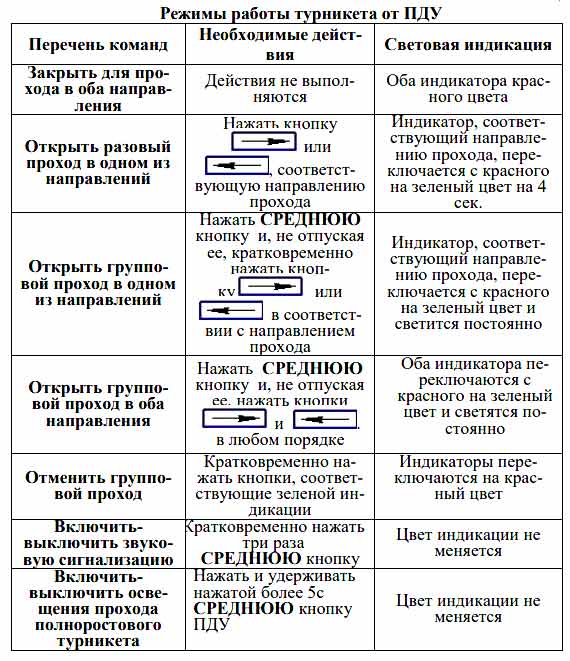 – одновременно нажаты и удерживаются кнопки «КН.1» и «КН.2» ПДУ, при этом оба световых индикатора светятся красным цветом, а звуковая сигнализация отключается. При снятии режима тревоги с ПДУ происходит отключение стопорного механизма, что позволяет поворачивать механизм в любом направлении до следующего исходного положения. В этом случае возможно перемещение механизма на один проход, при котором сигнал для СКУД о факте прохода не выдается.