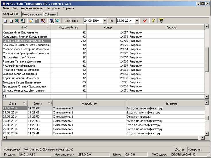 • Число событий журнала регистрации: от 230 000 до 870 000 (События подключенных контроллеров PERCo-CL201.1 хранятся в памяти контроллера ЭП)