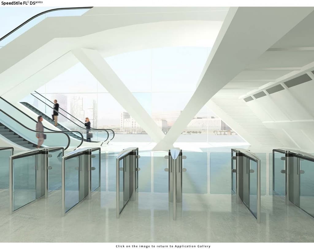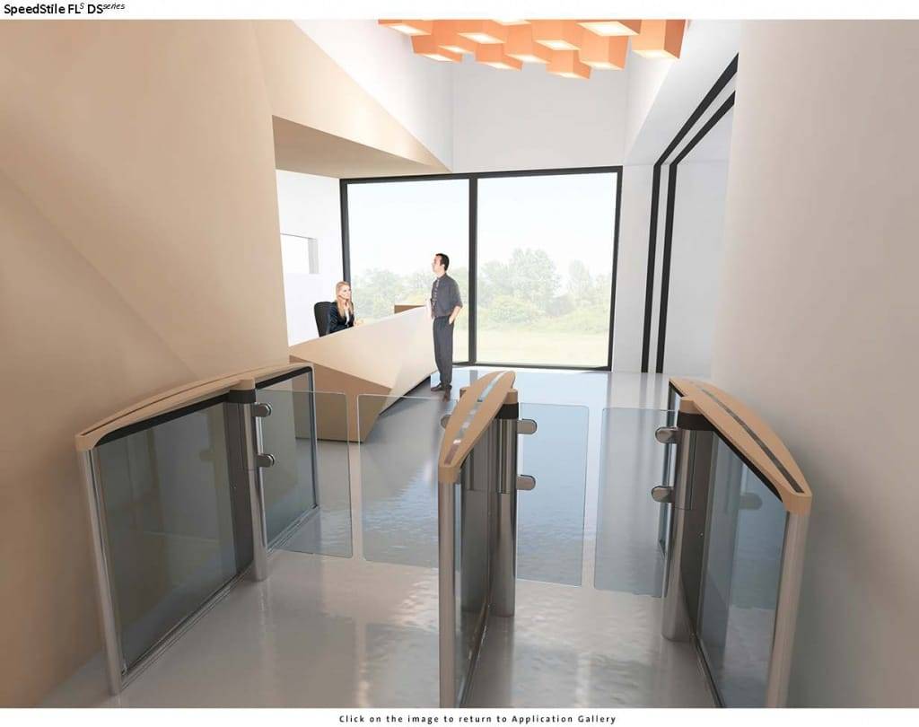 Турникеты с распашными створками SpeedStile FLS отличаются корпусом шириной 12 см с центральной секцией из 10 мм закаленного стекла.
