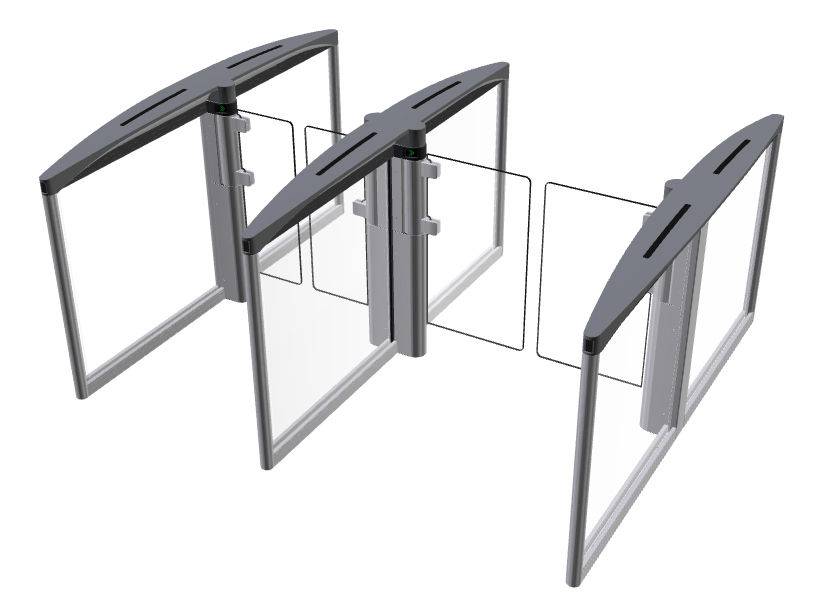 • Тип блокирующего элемента – распашные створки из 10 мм закаленного стекла или акрила на поворотном роторе (90°)
