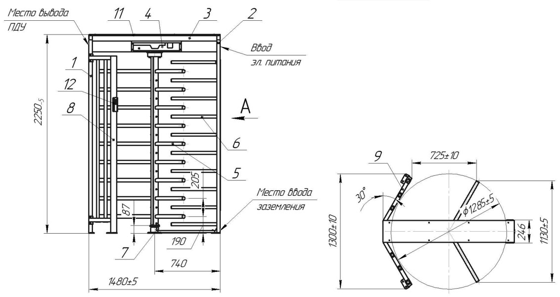 Турникет состоит из следующих частей: стойка крыла прохода 1, стойка ограничения прохода 2, которые крепятся к полу анкерными болтами. К стойкам фронтально крепится рама привода 3. На площадки рамы устанавливается механизм 4. На валу механизма закреплена эластичная муфта, к фланцу которой крепится верхний фланец центральной стойки. Центральная стойка состоит из трех лопастей 5, которые скрепляются между собой и крепятся к верхнему и нижнему фланцам. Нижний фланец закреплен к валу опоры центральной стойки 7.