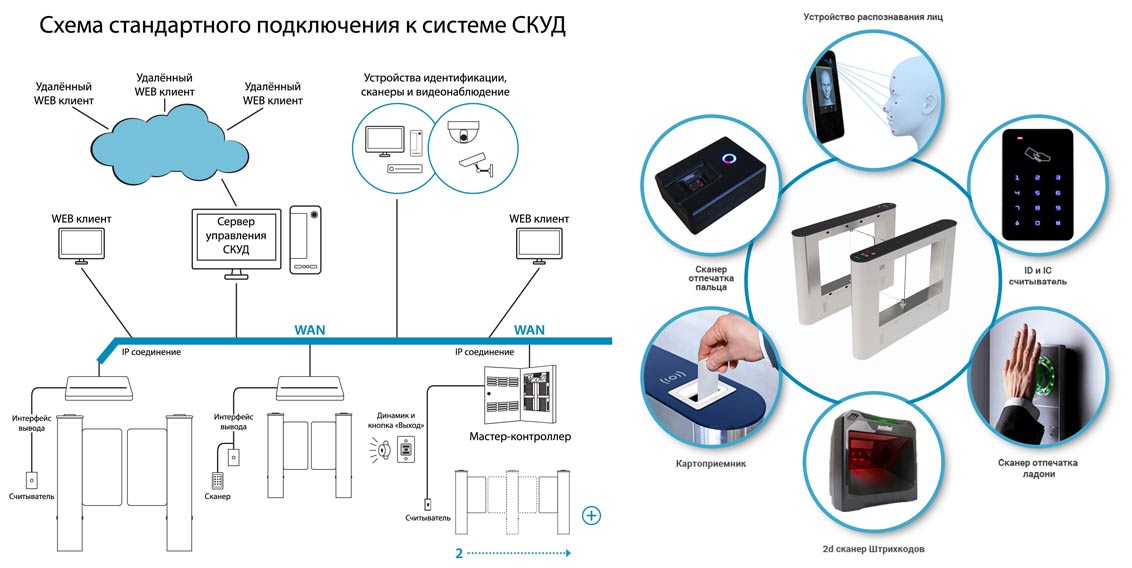 Работу проходной можно дополнить всевозможными модулями СКУД: биометрическими идентификаторами, сканерами, считывателями, картоприемниками и пр.
