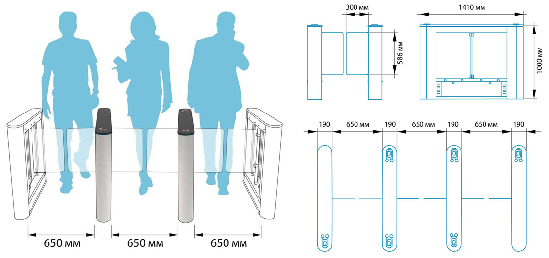 При использовании РСП 600 следует располагать параллельно друг другу в один ряд. Расстояние между тумбами турникета составляет 650 мм.