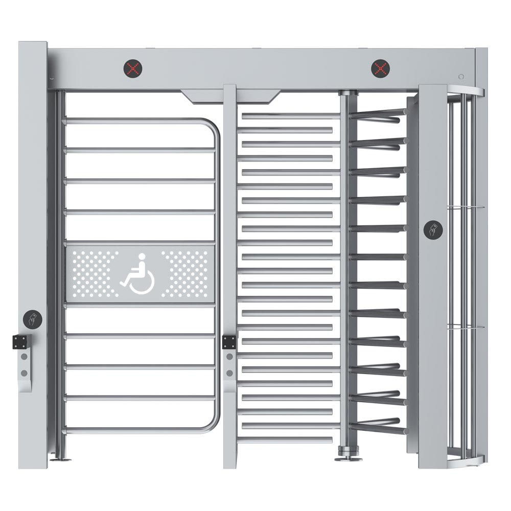 Полноростовый турникет с единой дополнительной калиткой и роторным блокиратором движения используется для контроля и ограничения доступа посетителей (в том числе с колясками, велосипедами, и людей с ограниченными возможностями) на объект. Обеспечивает поочередно вход и выход. Основная секция исключает преодоление лопастей (штанг) ротора. Устанавливается как самостоятельным блоком, так и составе модульного заграждения из нескольких турникетов.