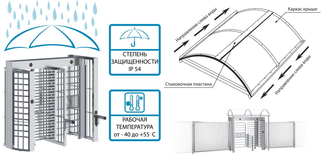 При использовании полноростового турникета СПЕКТР на открытом воздухе необходимо использовать защитный навес. Такие меры предосторожности предохраняют турникет от прямого воздействия влаги и различных атмосферных осадков, обеспечивая долгосрочную стабильную работу устройства. Эксплуатация крыши допускается при температуре окружающего воздуха от -40°С до +55°С и влажности воздуха до 90%.