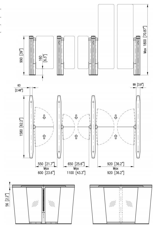 • Ширина прохода (2 боковых модуля): от 650 мм до 1100 мм