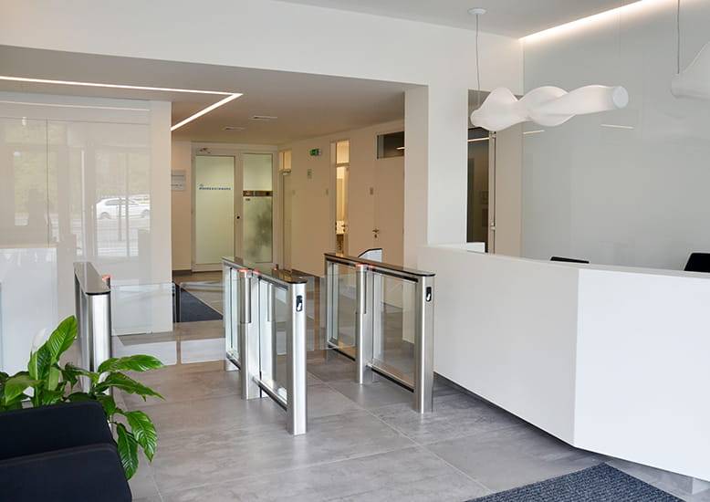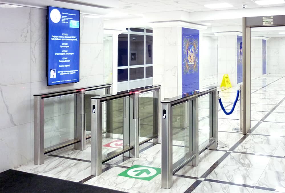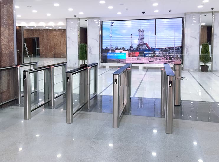 Система слежения снабжена двумя уровнями инфракрасных датчиков, 14 шт расположены на верхнем уровне и 28 на нижнем, что гарантирует безопасность прохода при высокой пропускной способности, а также защиту от прохода двух и более человек одновременно.