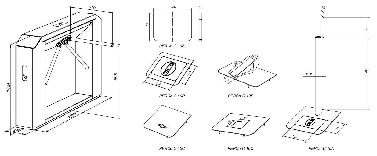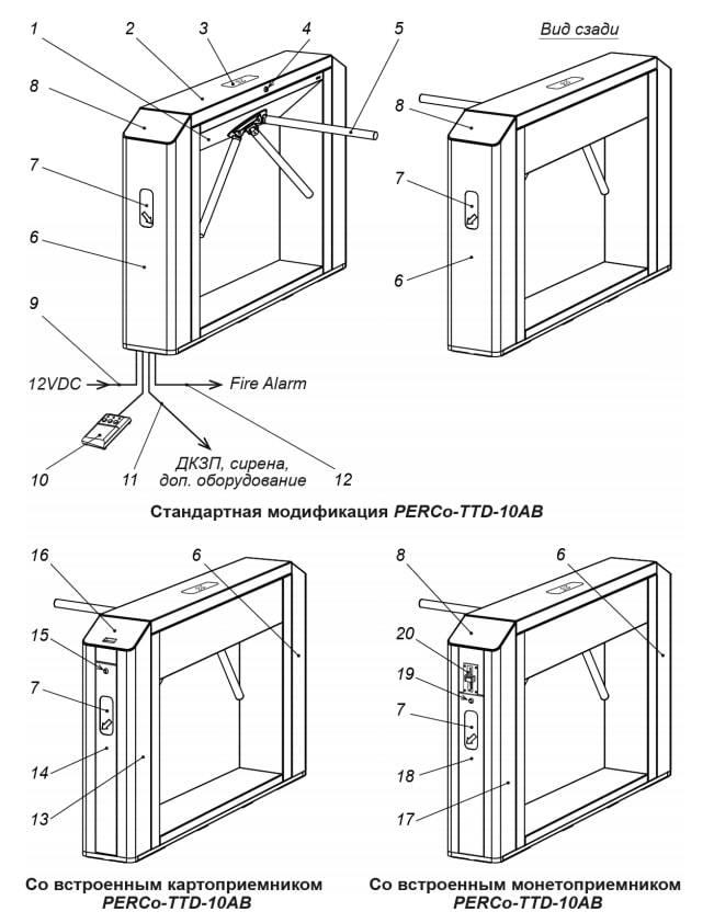 Турникет состоит из основной стойки (1) с установленным маховиком и тремя преграждающими планками (5), основной крышки (2) с блоком индикации (3) и замком (4), двух боковых модулей (6 – для модификации PERCo-TTD-10AB, 6 и 13 – для PERCo-TTD-10AС, 6 и 17 – для PERCo-TTD-10APR (PERCo-TTD-10APE)) с блоками постоянной индикации направления прохода / запрета прохода (7) и с боковыми крышками (8), а также ПДУ (10). Крепление преграждающих планок к маховику – шарнирное. Турникет крепится к установочной поверхности четырьмя