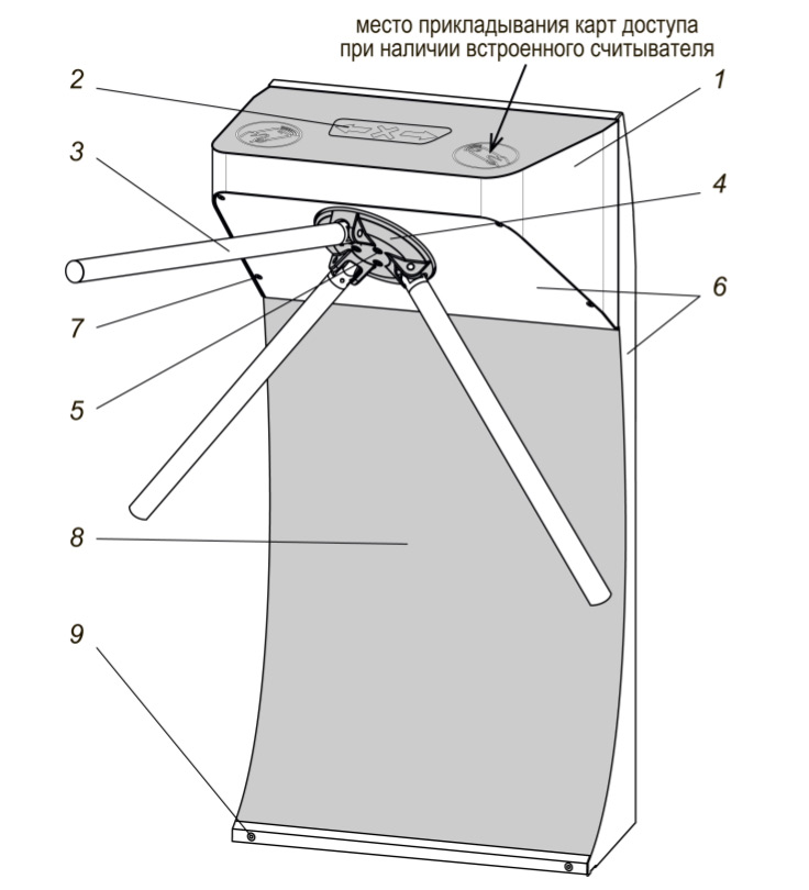 Общий вид турникета показан на рис. 2. Номера позиций в тексте настоящего руководства указаны в соответствии с рис. 2 и 3.