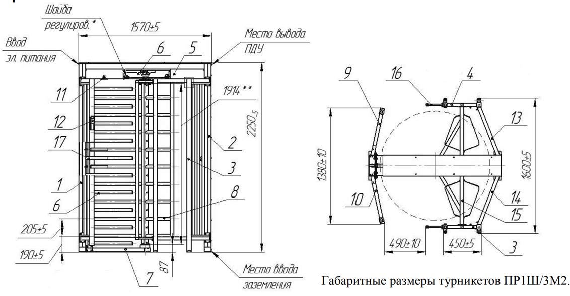 Турникет состоит из следующих частей: стойки ограничения прохода 1 и стойки шлюза 2, двух лицевых решеток 3 и 4 и напольной плиты 7, которые крепятся к полу анкерными болтами, гребенки 17 запрета прямого прохода в режиме шлюза. К стойкам вверху крепится рама привода 5. На раме привода в зонах прохода имеются отверстия для установки четырех светильников. На площадки рамы устанавливается механизм 6. На валу механизма закреплена эластичная муфта, к фланцу которой крепится верхний фланец центральной стойки. Центральная стойка состоит из трех лопастей 8, которые соединяются между собой и крепятся к верхнему и нижнему фланцам. Нижний фланец закреплен на валу напольной плиты 7. К боковым поверхностям стойки ограничения прохода 1 крепятся боковые ограждения 9 и 10. В стойки ограждений вмонтированы световые индикаторы 12 разрешения (зеленый свет) или запрета (красный свет) прохода.