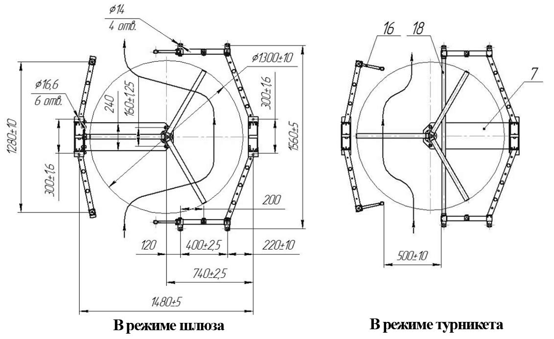 Для ужесточения режима пропуска по одному используются формирователи прохода 16. Турникет можно использовать как в режиме шлюза, так и в режиме турникета.